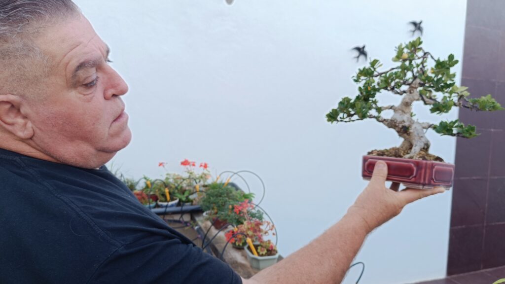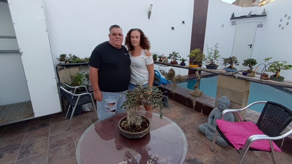 María José Serrano, su pareja sentimental, también se declara una apasionada de los bonsáis. Desde el principio le llamó la atención y con la ayuda de Juan ha aprendido muchísimo. Reconoce que no todos los árboles son iguales, unos necesitan más tiempo y cuidados que otros. Dada su delicadeza, precisan que los manipulen unas manos cuidadosas, solo así se puede garantizar que salgan adelante.